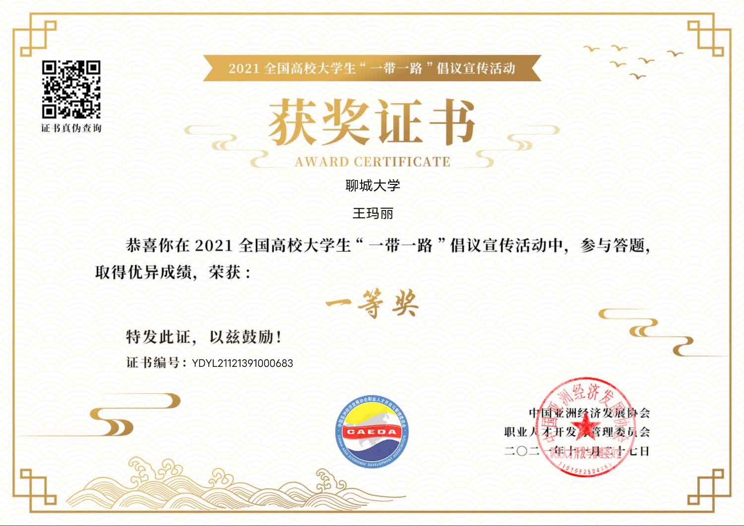 王玛丽在2021全国高校大学生“一带一路”倡议宣传活动中获得一等奖